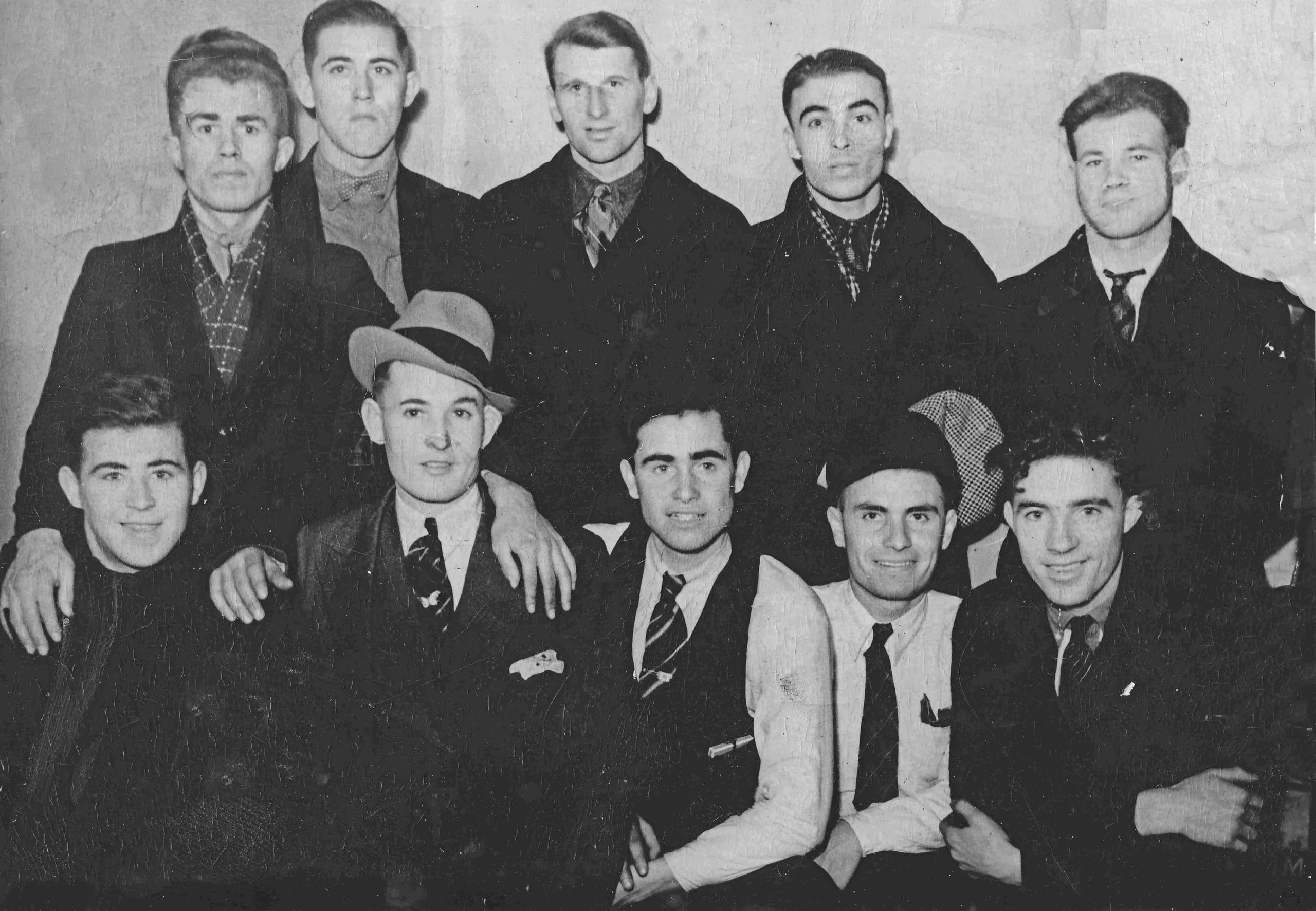 The 4th person in the middle row kneeling has been identified as Jim Gibbons (1914-) of St. Mary’s Bay, NL.